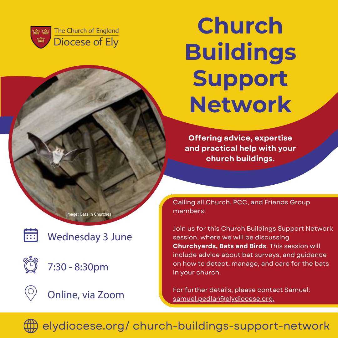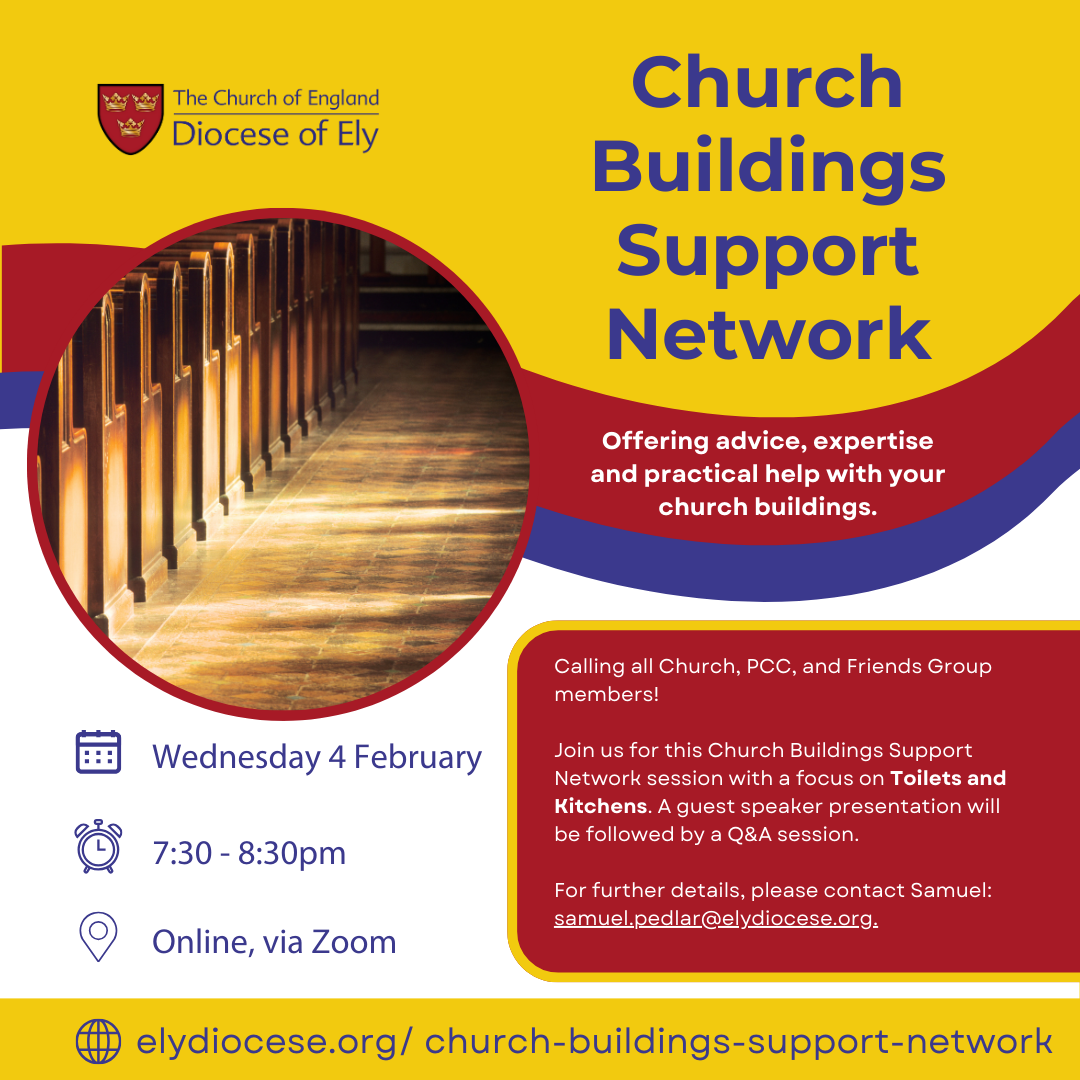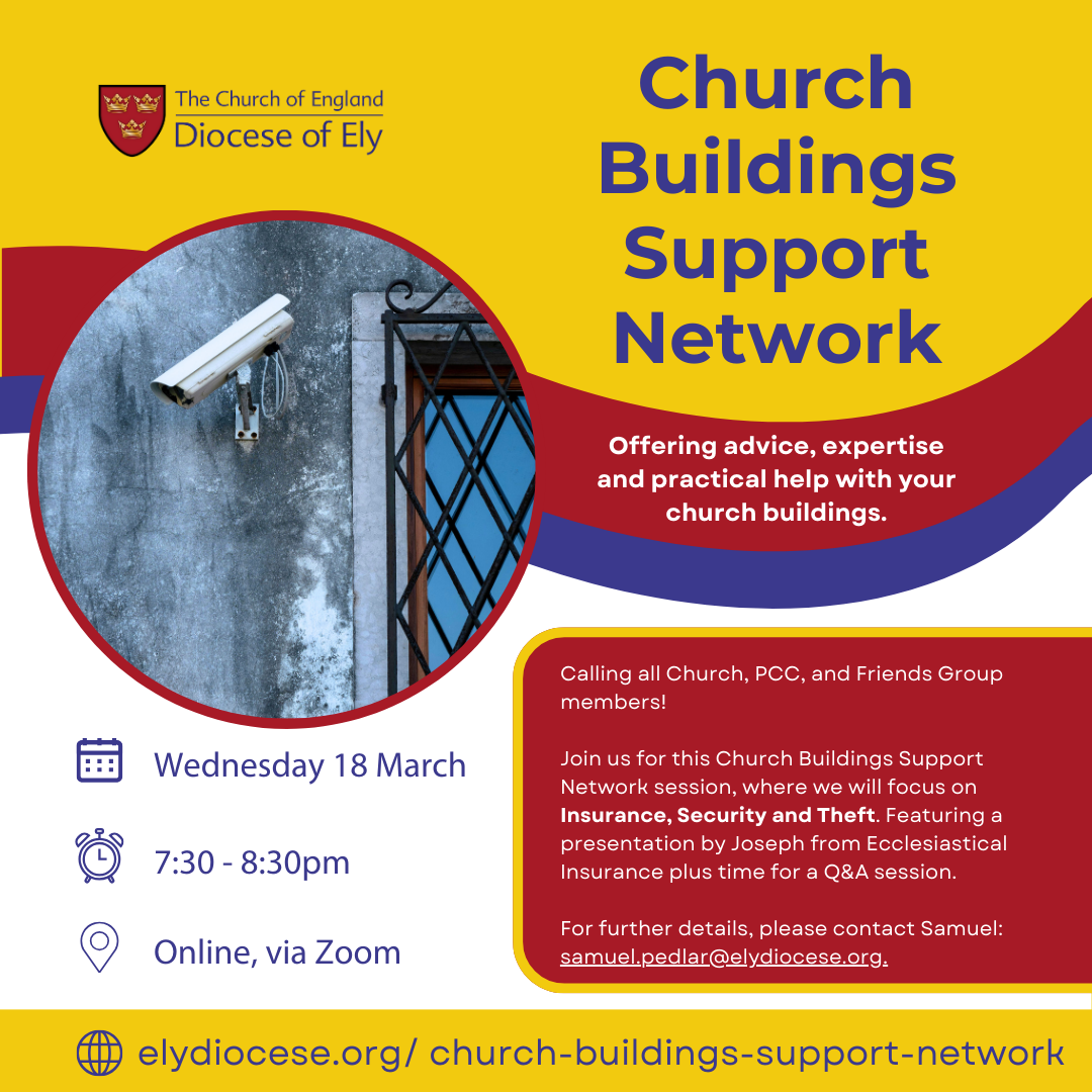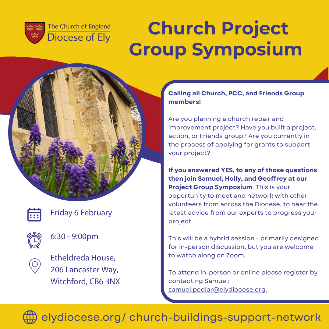 You can find details of all the planned sessions for the year on our Church Buildings Support Network page. For further details on any of the events, please contact Samuel on samuel.pedlar@elydiocese.org or 07539 916607.