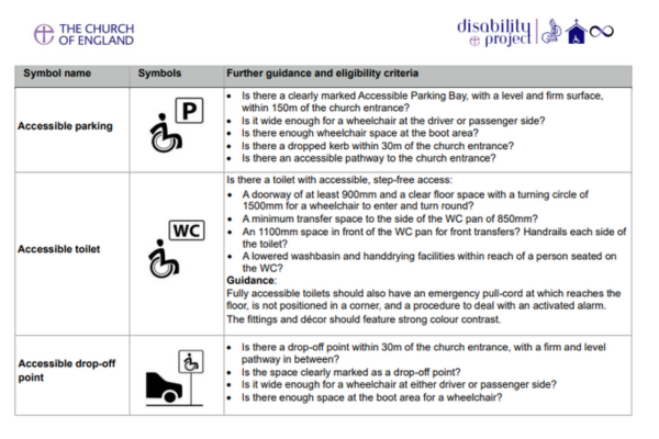 These symbols have been developed for use across the Church of England and comprise an icon-based, accessibility self-assessment tool for church use in online and printed signage.