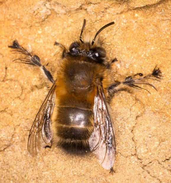 March can be a cold month and not one we associate with insects, the majority of which will emerge a little later in the year. Bumblebees are amongst the first to appear as their hairy bodies give them some insulation against the changeable weather of March; but have a look for another bee, which looks at first glance like a small bumblebee, but which is actually the delightfully named Hairy-footed Flower Bee. The males emerge first and can be found from late February onwards. The male is a rusty brown with a yellow face and long hairs on the middle pair of its six legs. It is these long hairs that give the bee the name of ‘hairy footed’. About two weeks later the females emerge, looking completely different. Females are mainly black with orange hairs on their back pair of legs which act like little brushes, collecting pollen as they visit flowers. Hairy-footed flower bees have a long tongue which they use to probe into flask- shaped spring flowers such as primrose and lungwort (or pulmonaria). It is worth checking primroses and lungworts for this little bee, they have a faster, more zippy flight than a bumblebee and also a shrill buzz.