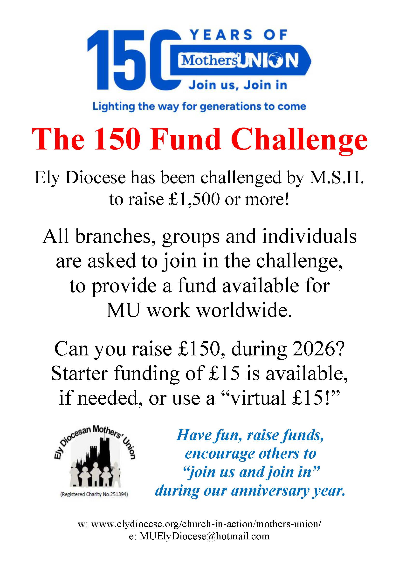 Ely Diocese has been challenged by M.S.H. to raise £1,500 or more! All branches, groups and individuals are asked to join in the challenge, to provide a fund available for MU work worldwide. Can you raise £150, during 2026? Starter funding of £15 is available, if needed, or use a “virtual £15!”