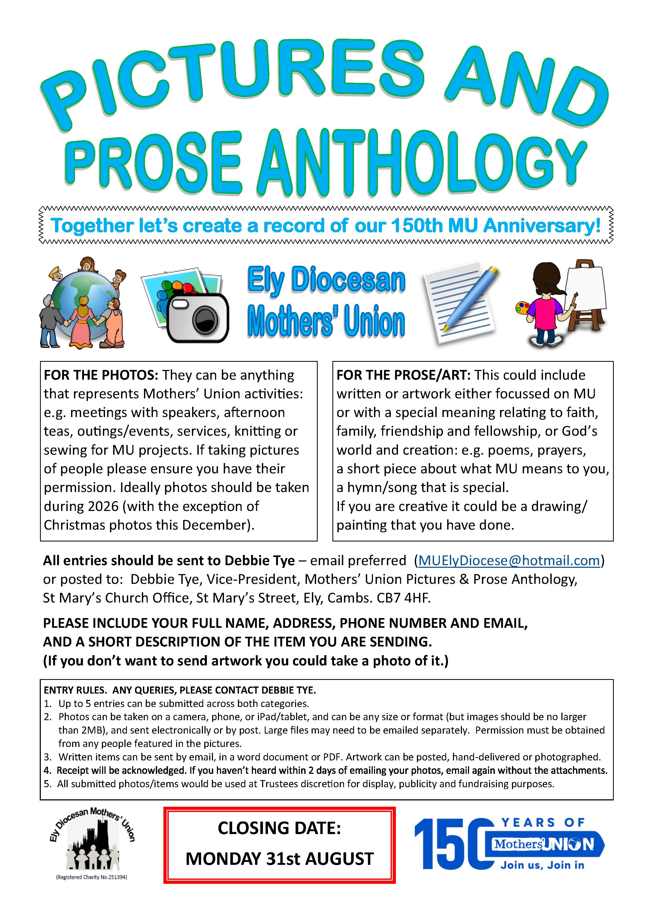 We are going to put together an Anthology to celebrate 150 years of Mothers’ Union, which can be published in a booklet and/or video. In 2020 we ran a photo competition, but for 2026 we are widening the content to include written items and artwork, as well as photos. Full entry details are available here.