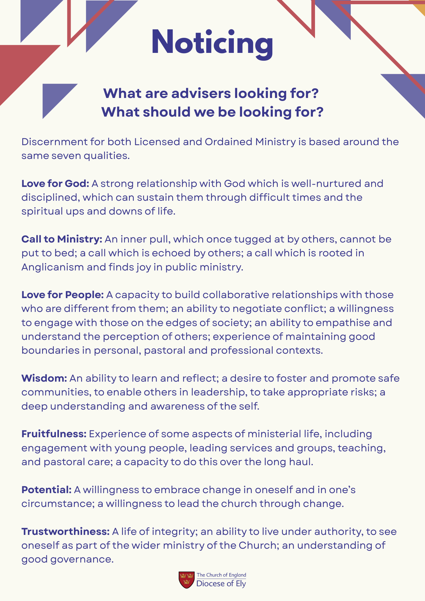 Discernment for both Licensed and Ordained Ministry is based around the same seven qualities. If you’re wondering what is being looked for, we’ve developed this guidance to help us all notice the gifting and calling of others.