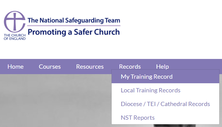 Login to the Church of England Training Portal. Choose the Records drop down menu and select My Training Record to see the expiry date of any of the courses you have completed via the portal. (Please note that only those Leadership courses that have been booked and completed via this portal will appear here.)