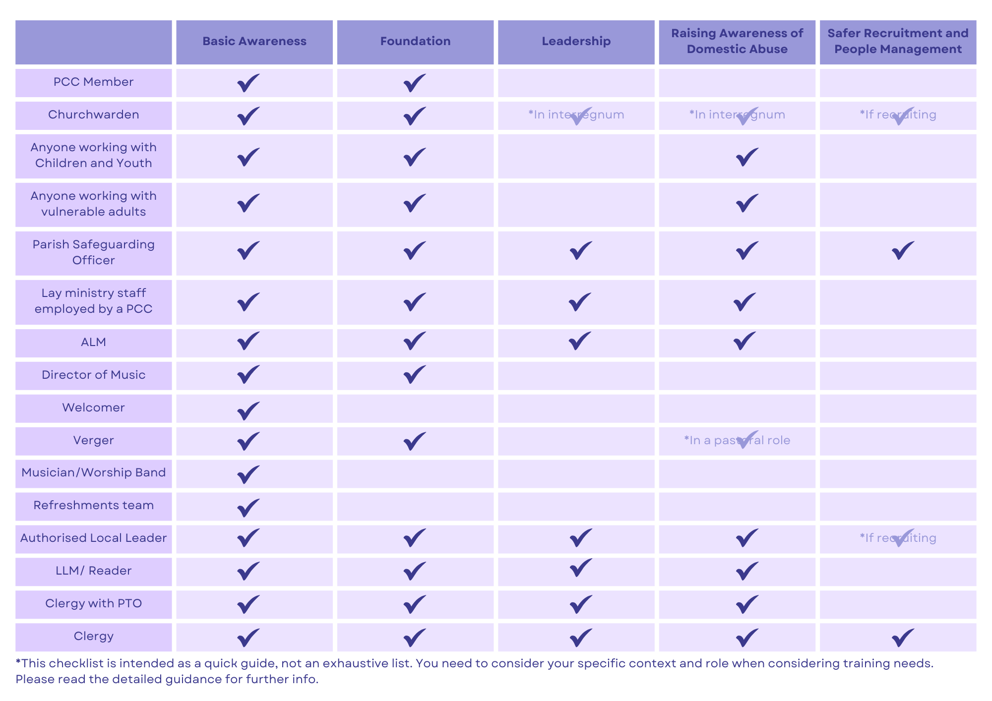 Those who hold positions of responsibility will require more in-depth learning than those who do not. For example, a member of clergy will require learning to Leadership level whereas a volunteer who is acting as an additional adult at a youth group session would require learning to Foundation level.