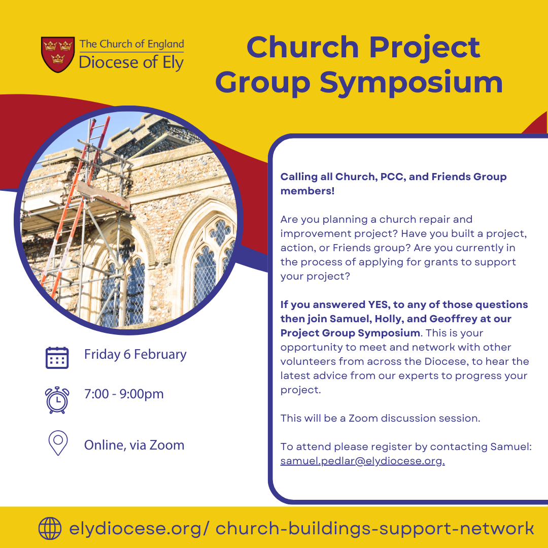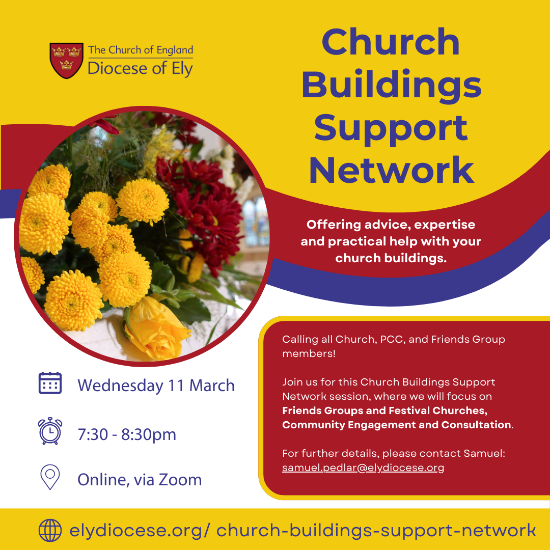 You can find details of all the planned sessions for the year on our Church Buildings Support Network page. For further details on any of the events, please contact Samuel on samuel.pedlar@elydiocese.org or 07539 916607.