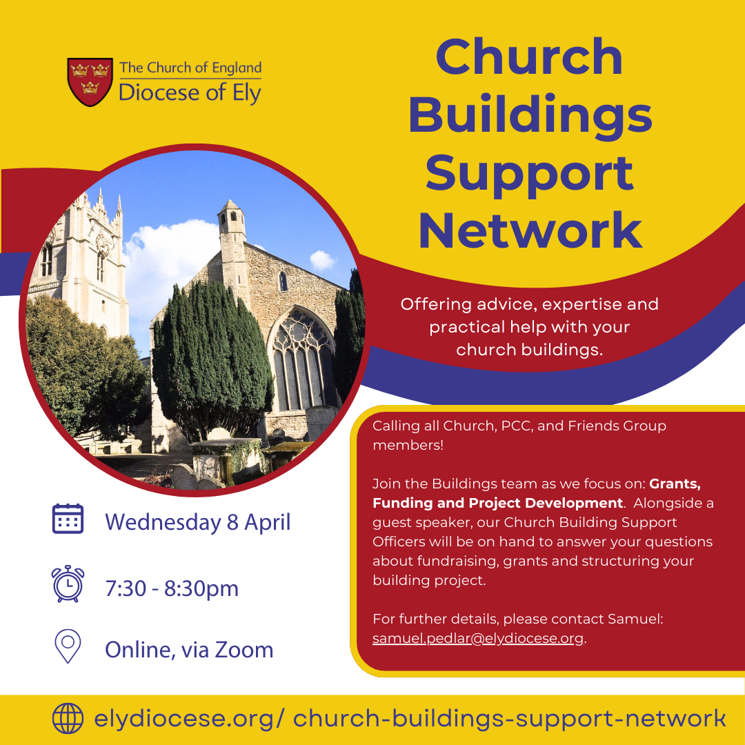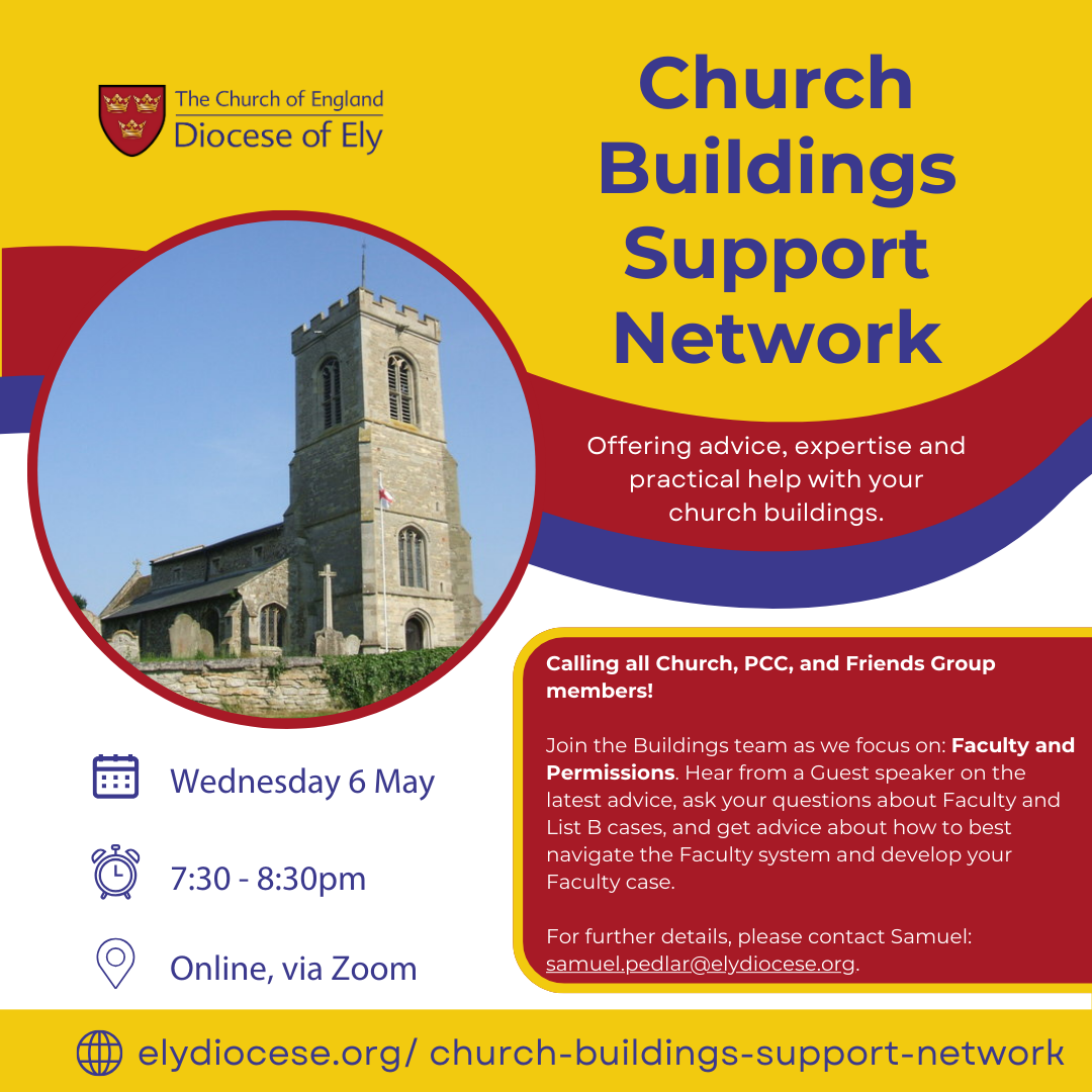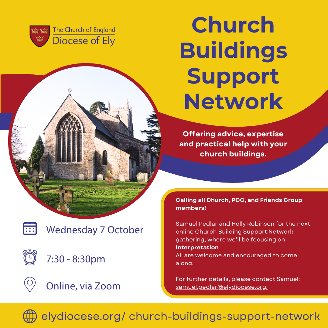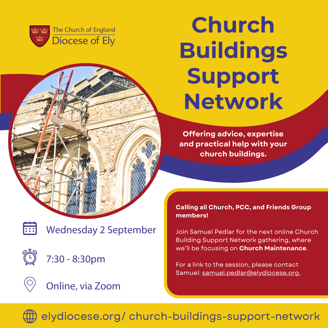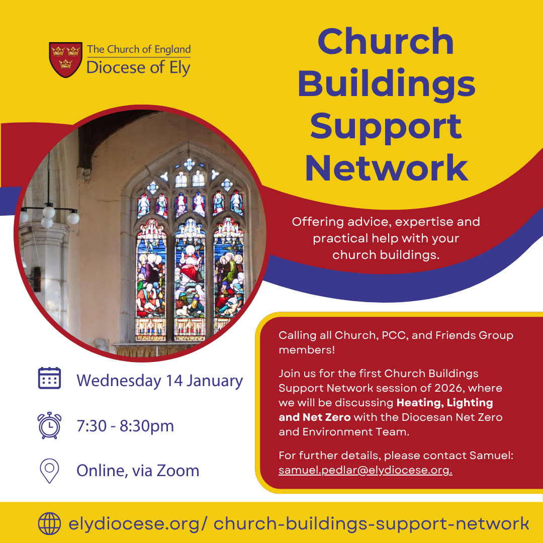 You can find details of all the planned sessions for the year on our Church Buildings Support Network page. For further details on any of the events, please contact Samuel on samuel.pedlar@elydiocese.org or 07539 916607.