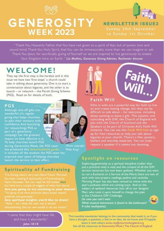 Generosity Week gives us some time and space to focus on God's loving generosity to us, and what our response might be. This year there are monthly newsletters telling you about new resources and sharing stories of generosity.