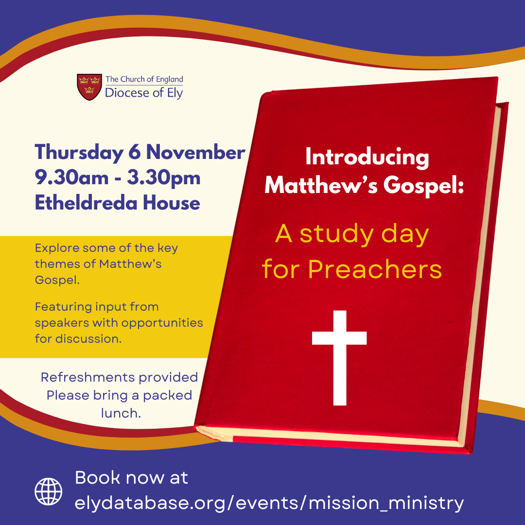 A study day for preachersFrom Advent 2025 the lectionary follows the Gospel according to Matthew through the Christian year. The Diocese of Ely is pleased to offer this study day for preachers, which explores some of the key themes of Matthew’s Gospel. There will be input from speakers and opportunities for discussion. Refreshments will be provided on arrival but please bring a packed lunch.