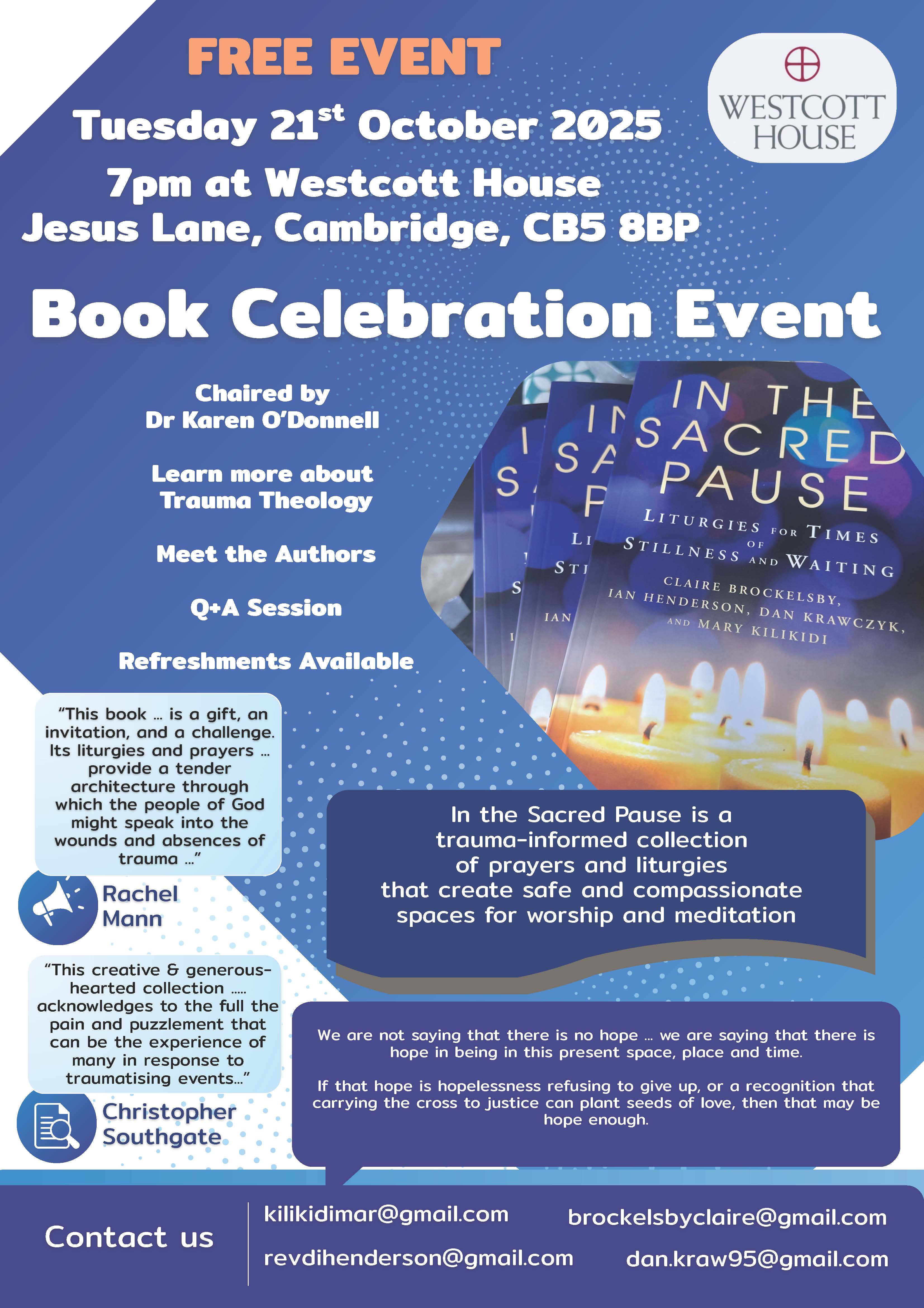 Westcott House are hosting a celebration event on Tuesday 21 October at 7pm to recognise and launch the book 'In the Sacred Pause: A trauma-informed collection of prayers and liturgies that create safe and compassionate spaces for worship and meditation'. More info