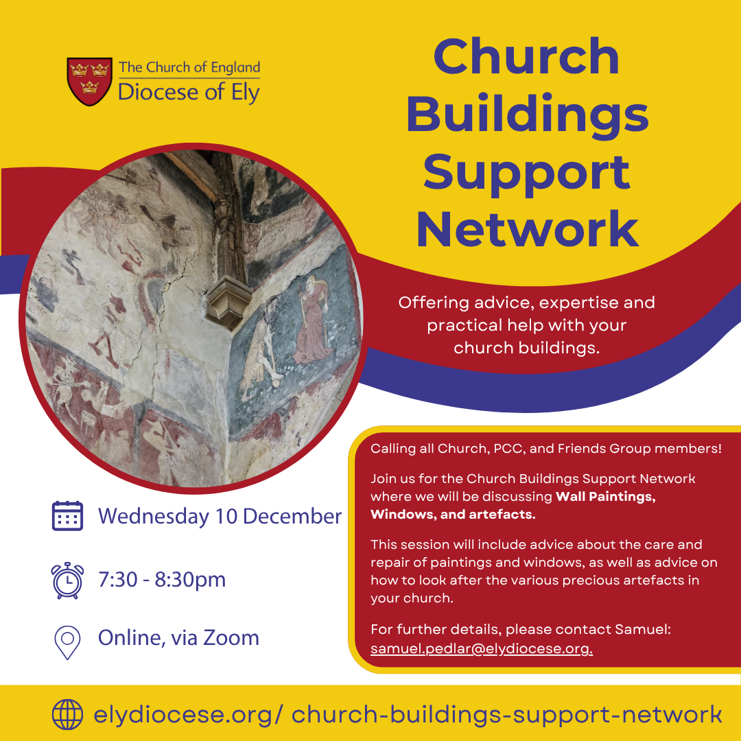 Wall Paintings, Windows, and artefactsThese online sessions all run from 7.30 - 8.30pm on Zoom. For a link to join any of the sessions, please contact Samuel: samuel.pedlar@elydiocese.org.