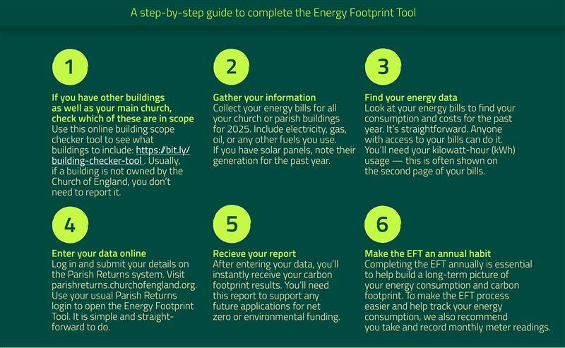 Completing the EFT is a simple but powerful way to support the Church of England’s shared journey to net zero. Each year’s data builds a clearer picture of our carbon footprint and helps us act more strategically together.